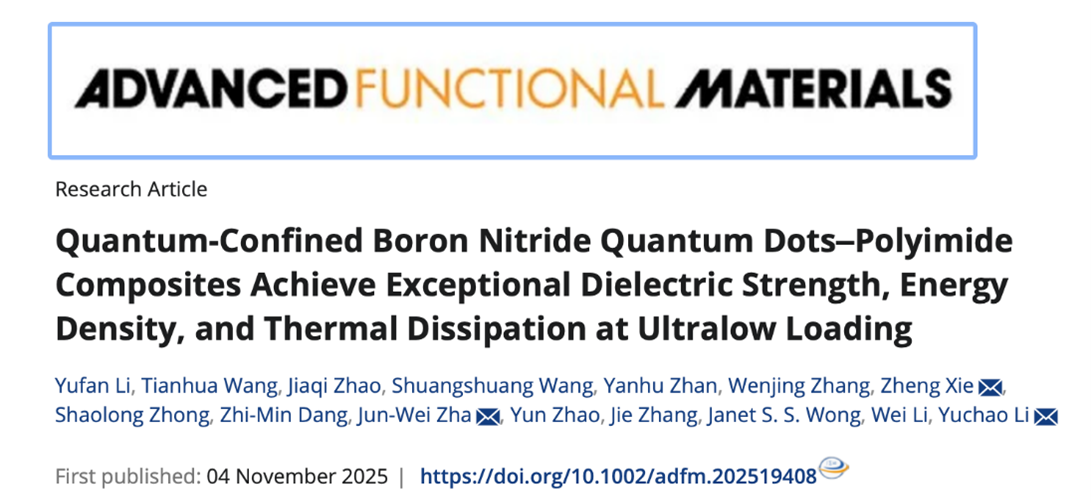 近日,聊城大学材料科学与工程学院李玉超教授团队联合济南大学谢政教授、华北电力大学查俊伟教授,在兼顾耐高温导热储能电介质材料方面取得新的进展。相关成果以“Quantum-confined boron nitride quantum dots-polyimide composites achieve exceptional dielectric strength, energy density, and thermal dissipation at ultralow loading”为题,发表在国际顶级期刊《Advanced Functional Materials》(一区TOP期刊,IF="19.0)上。论文第一作者为硕士研究生李雨凡同学,通讯作者为李玉超教授,聊城大学为第一署名单位。