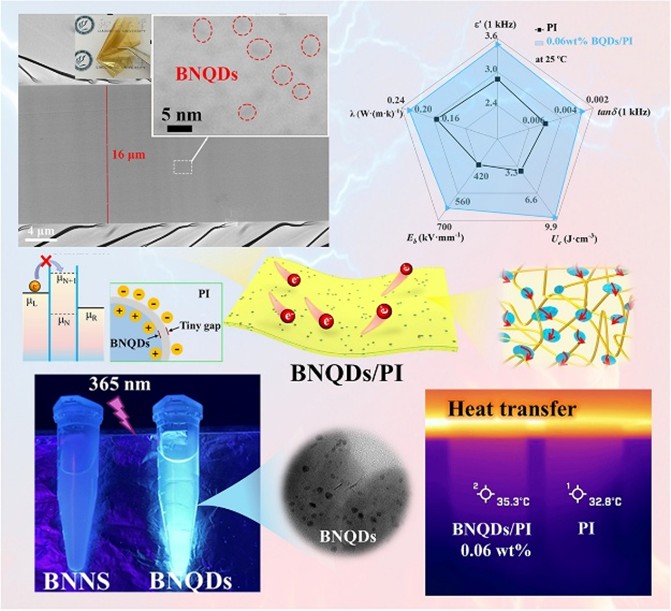 Fig. 2 Structure, electrical and thermal management properties of BNQDs/PI dielectric film.