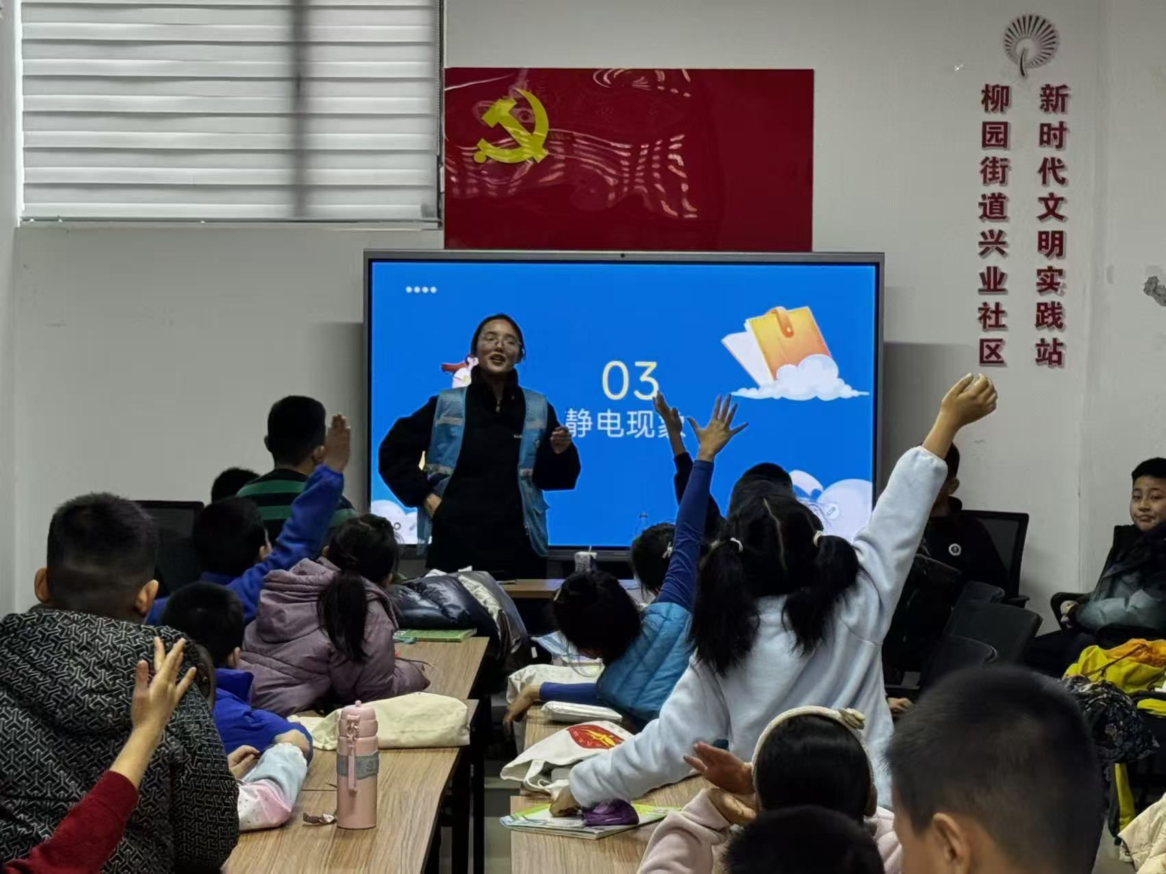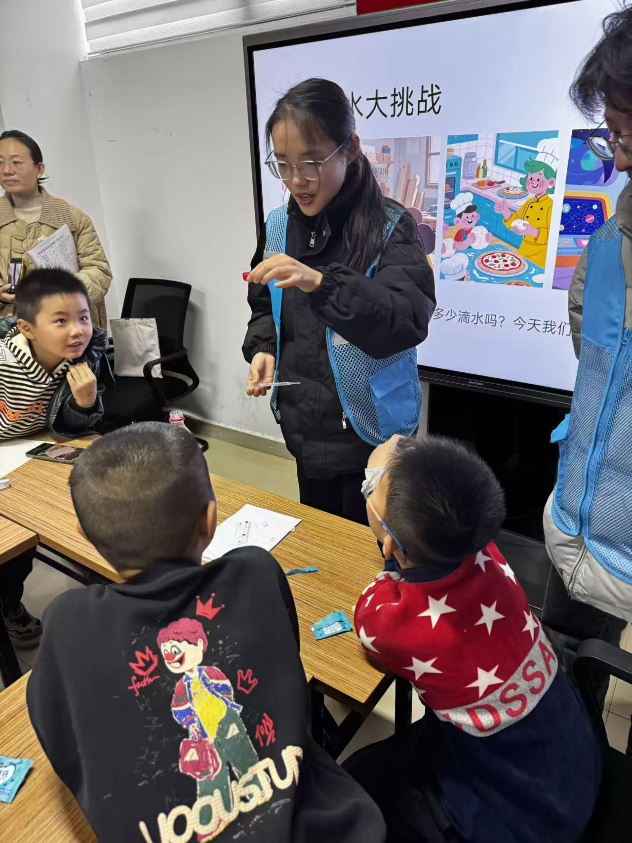 志愿者们为社区孩子提供一对一作业辅导,细致解答问题,帮助他们梳理思路、巩固知识。随后进行的趣味实验环节,通过“表面张力”“丁达尔效应”和“静电吸附”等简单实验,生动展示科学原理,激发孩子们的好奇心与探索欲。活动中,志愿者还准备了盲盒福袋作为互动鼓励,让孩子们在收获知识的同时感受快乐。