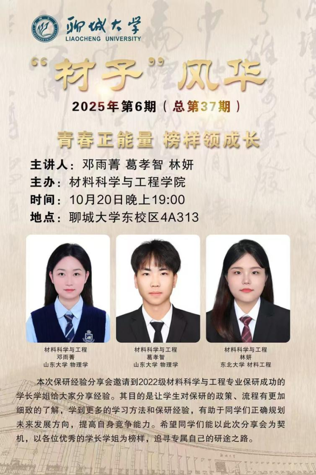为帮助学院低年级学生精准把握保研政策,系统掌握备考策略,2025年10月20日,聊城大学材料科学与工程学院于东校区 4#A313 教室顺利举办“材子”风华—材料科学与工程专业保研经验交流会,邀请2022级优秀保研学子邓雨菁、葛孝智、林妍担任主讲嘉宾,他们结合自身保研经历,从不同维度为在场同学提供了全面且实用的经验指导。