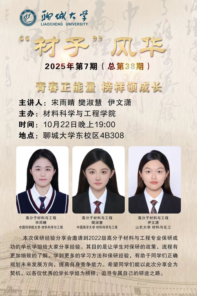 为助力学院学子明晰保研路径、精准掌握关键信息,科学规划学业发展,2025年10⽉22⽇,聊城大学材料科学与工程学院于东校区4#B308教室顺利举办“材子”风华--高分子材料与工程专业保研经验交流会,邀请2022届优秀保研学子宋雨晴、樊淑慧、伊文潇担任主讲嘉宾,为低年级同学分享保研经验、答疑解惑。