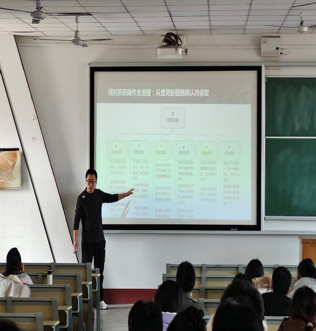 互动环节中,同学们积极提问,老师们耐心解答,现场交流氛围浓厚。最后,孙静雯学姐结合自身复试与调剂经历,分享了她如何通过调剂系统精准匹配院校、准备调剂材料以及跟进录取进程的实践经验。她的分享内容详实、贴近实际,使在场学生对调剂操作有了更直观深入的理解。