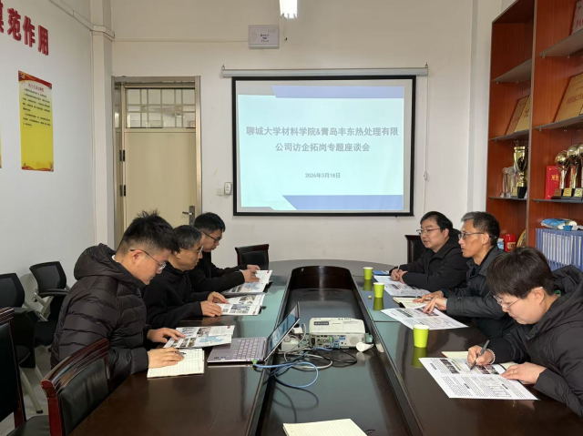 为深入贯彻落实产教融合战略,拓展毕业生就业渠道,2026年3月18日,聊城大学材料科学与工程学院与青岛丰东热处理有限公司在东校区4#A121党员活动室联合开展访企拓岗专题座谈会。学院党委副书记郑永朝、金属材料与工程系主任赵性川、团委辅导员陆含,以及青岛丰东热处理有限公司综合管理部祝传升、郭春红,潍坊丰东热处理有限公司综合管理部申同川出席本次座谈会。